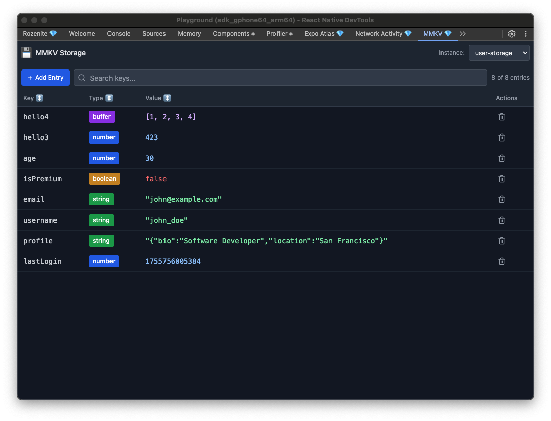 The MMKV plugin is a powerful debugging tool that helps you inspect and manage MMKV storage instances in your React Native application. It provides:
